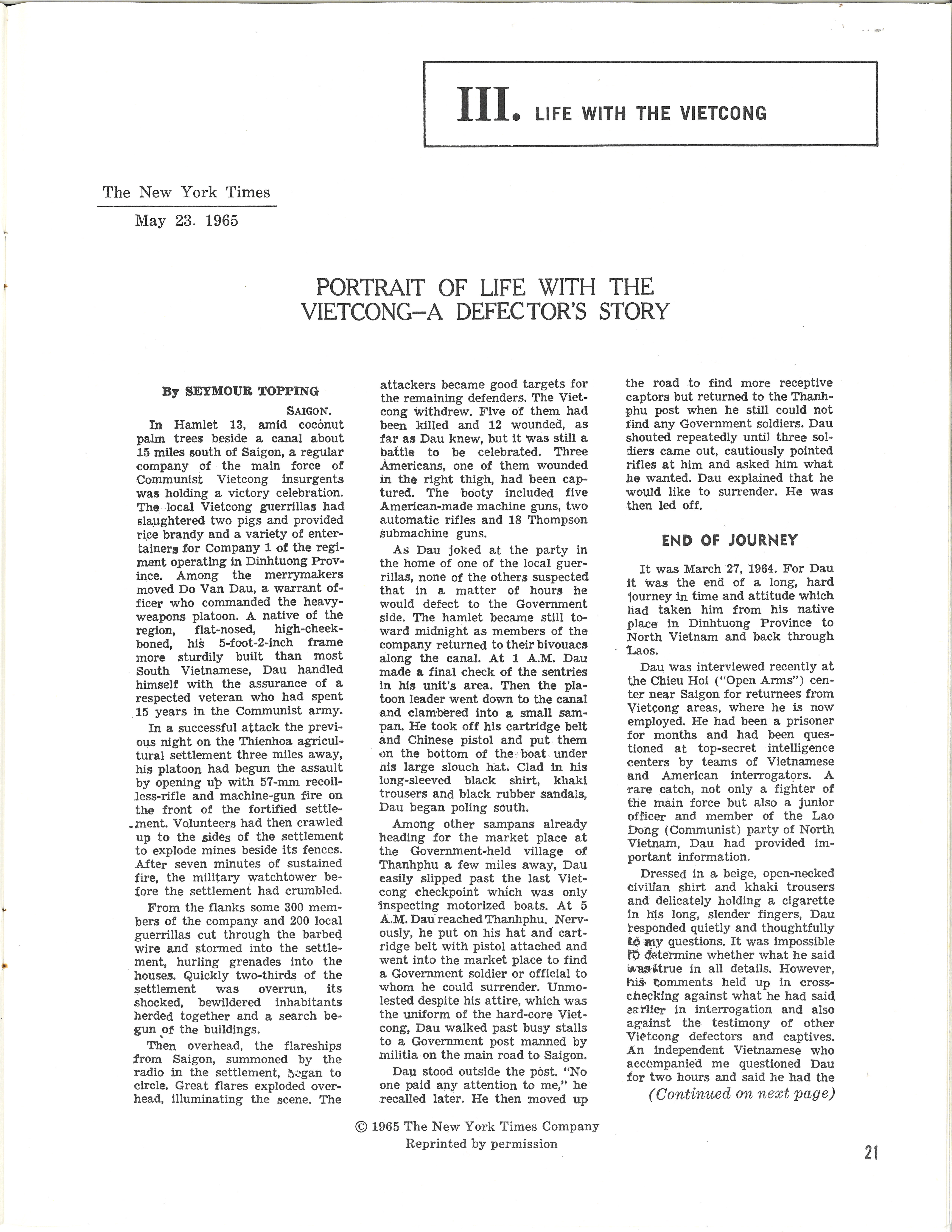 "Portrait Of Life With The Vietcong - A Defector's Story" by Seymour Topping, The New York Times, May 23, 1965