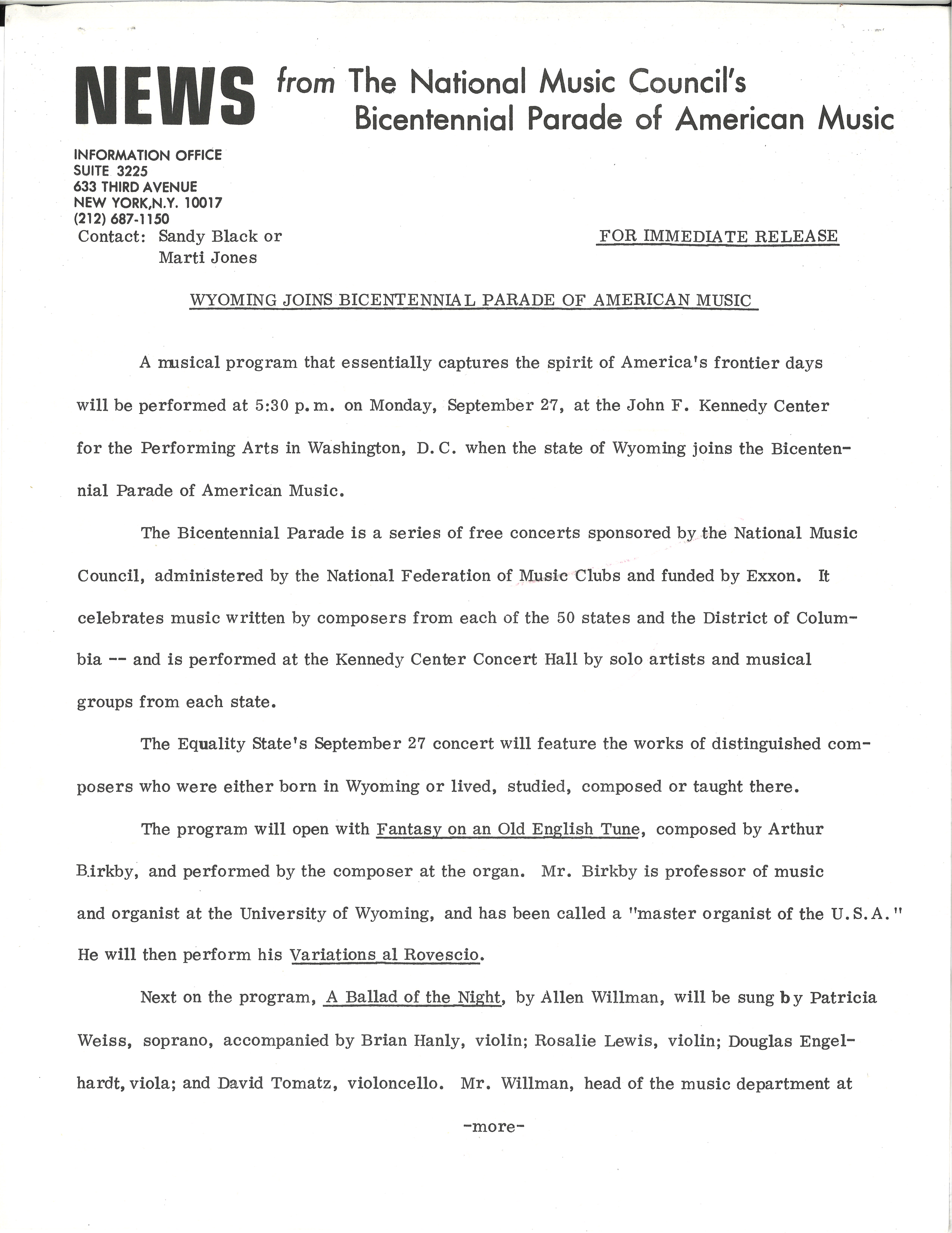 This press release from the National Music Council's Bicentennial Parade of American Music announces a musical program on September 27, 1976 featuring artists and composers who were either born in Wyoming or lived, studied, composed or taught there.