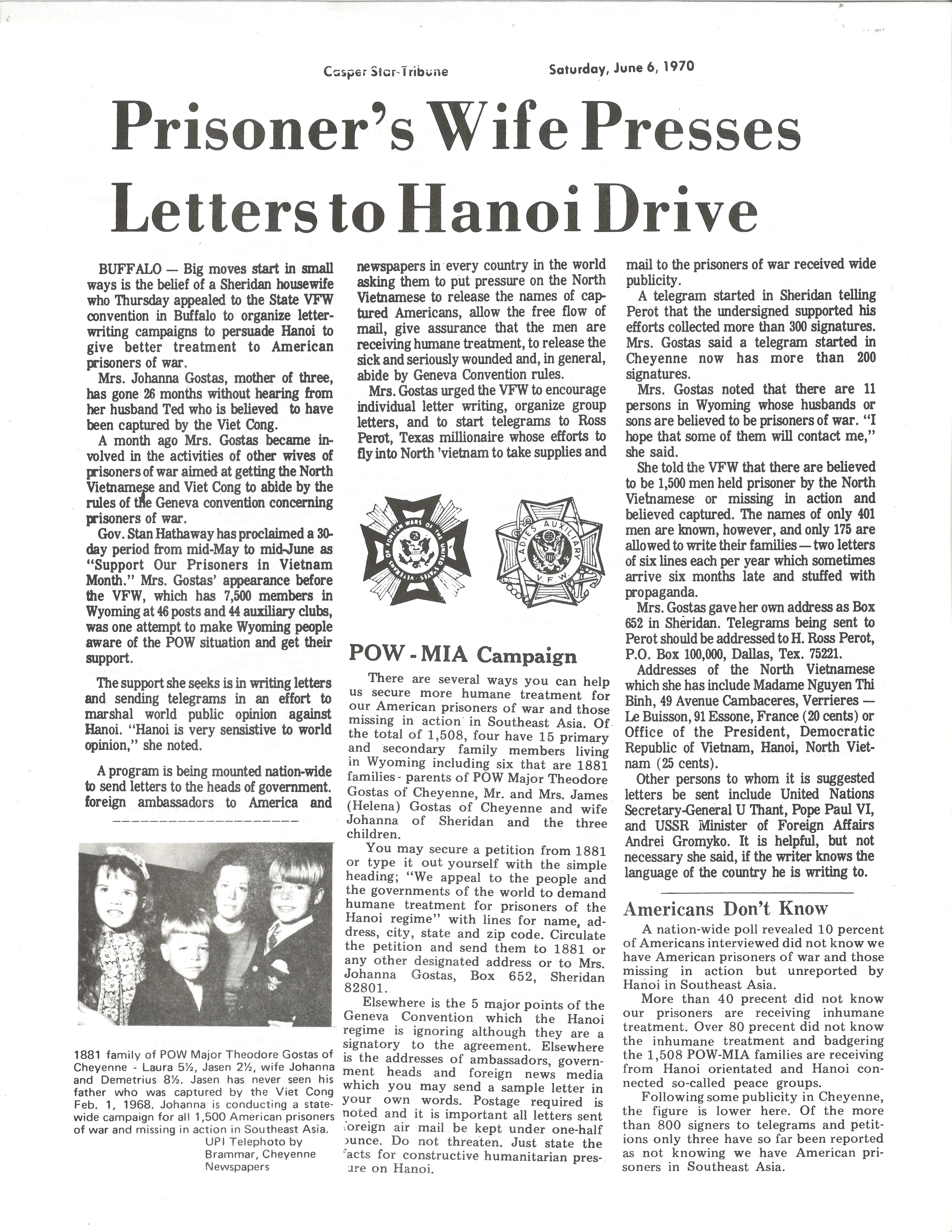 Johanna Gostas, whose husband was captured by the Viet Cong, urged Wyoming veterans and citizens to start a letter-writing campaign demanding humane treatment for American prisoners of war. She asked people to pressure North Vietnam to follow the Geneva Convention by releasing names of prisoners, allowing mail, and caring for the sick and wounded. The campaign encouraged individuals to write letters, sign petitions, and send telegrams, stressing that this was a humanitarian issue, not a political one.