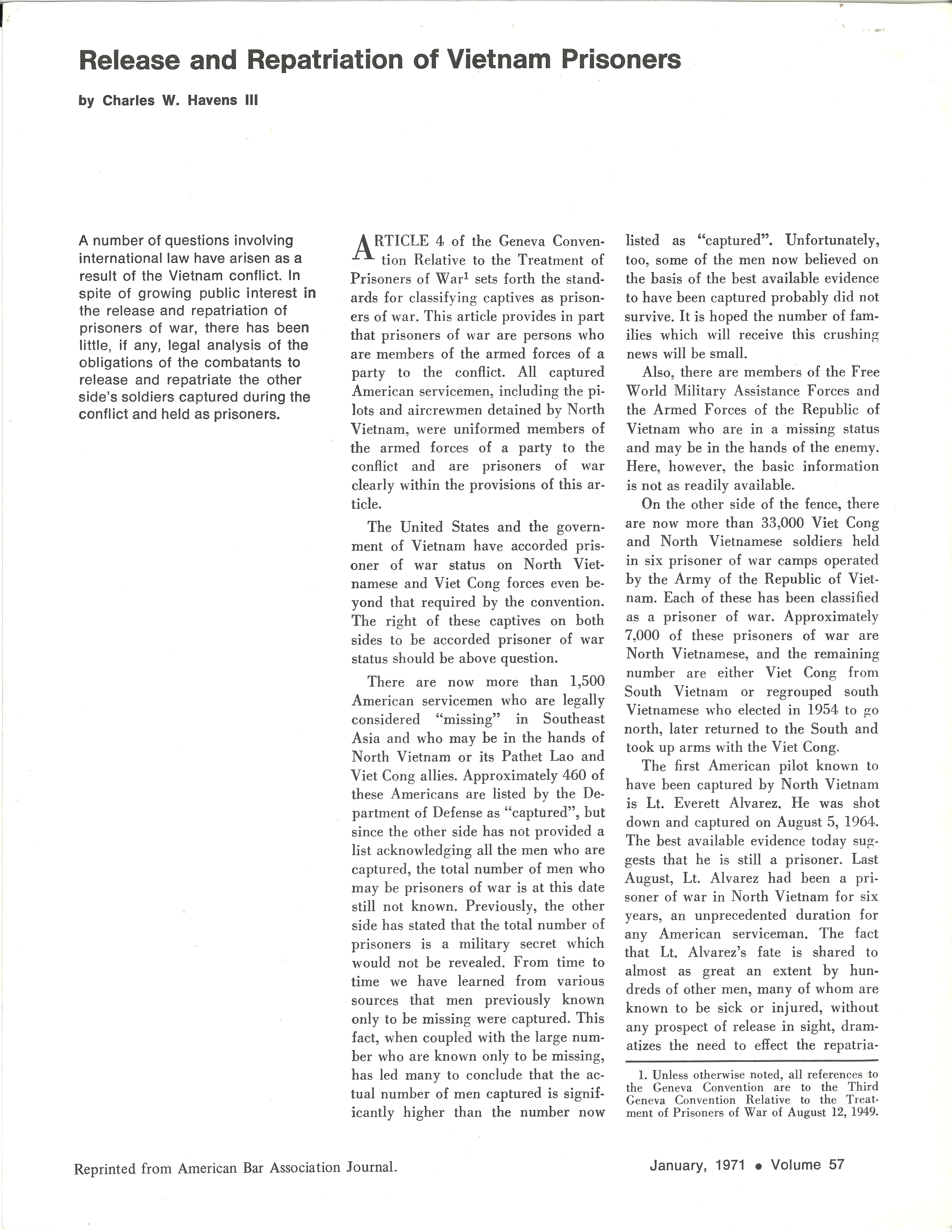 "Release and Repatriation of Vietnam Prisoners" by Charles W. Havens III, American Bar Association Journal, January 1971