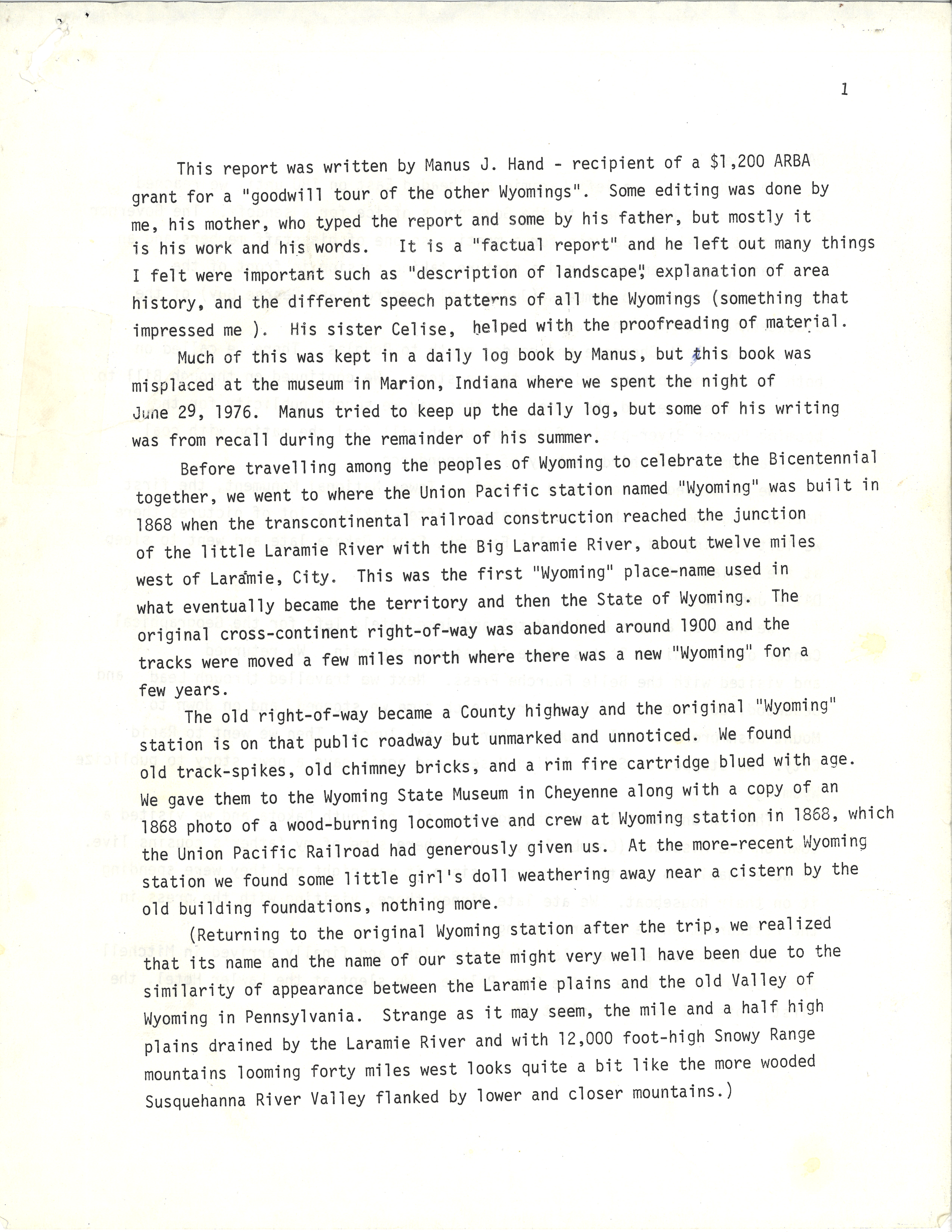 This report describes Hand's trip across the United States during the summer of 1976 on a goodwill tour of other "Wyomings". The trip was funded by a Bicentennial grant.