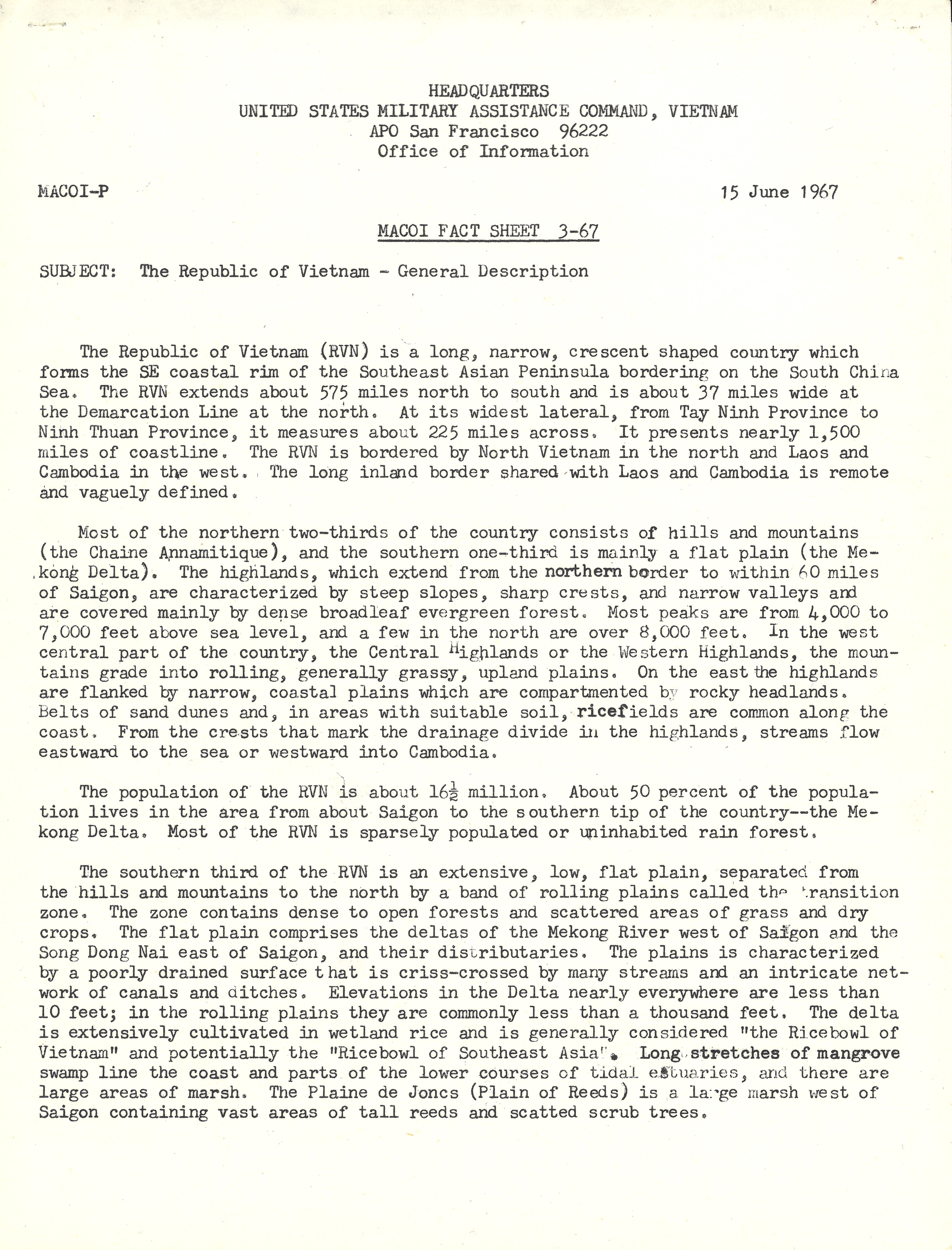 This fact sheet, distributed by the Office of Information of the U.S. Military Assistance Command Vietnam, provides basic facts about South Vietnam.
