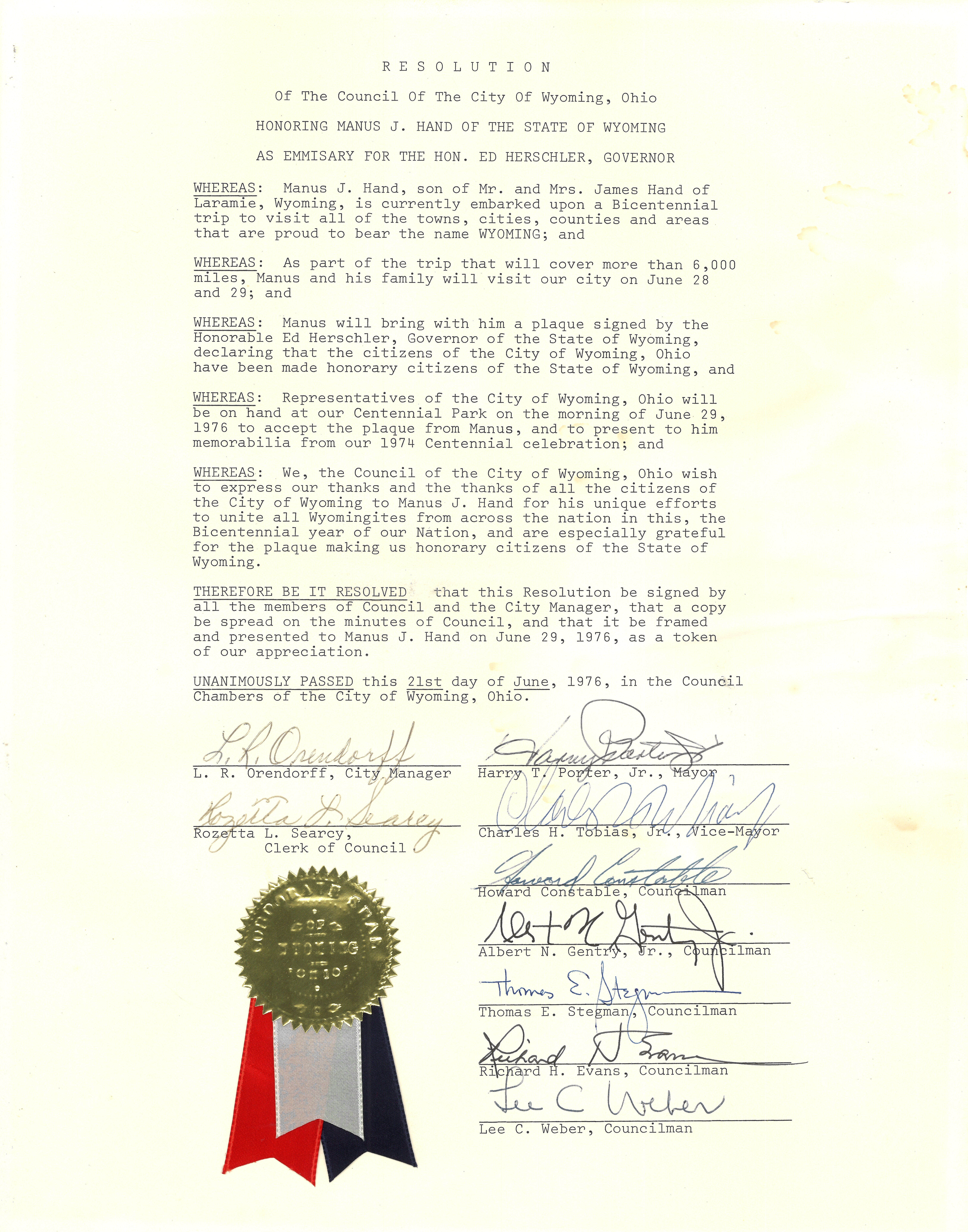 This resolution honors Manus J. Hand as the emissary for Wyoming Governor Ed Herschler and was presented to Hand on June 29, 1976 during Hand's Bicentennial trip.