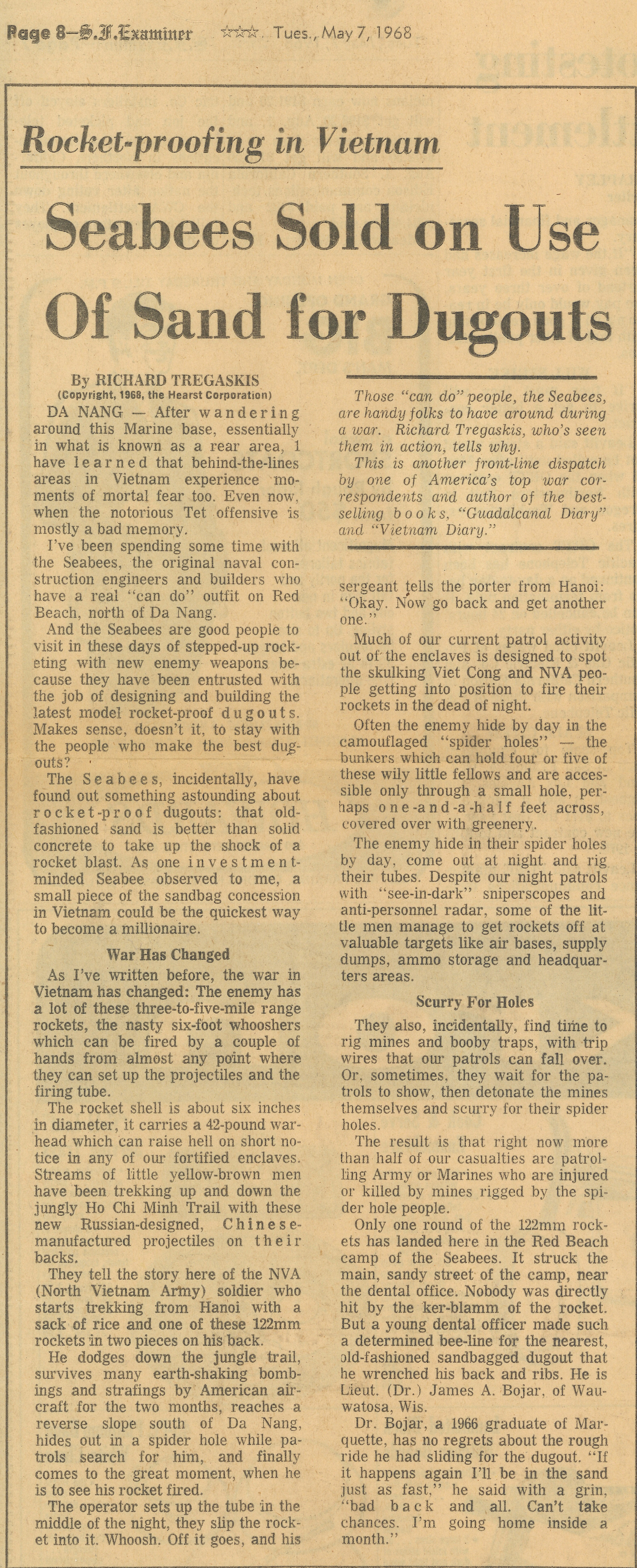 "Seabees Sold on Use of Sand for Dugouts" by Richard Tregaskis, San Francisco Examiner, May 7, 1968