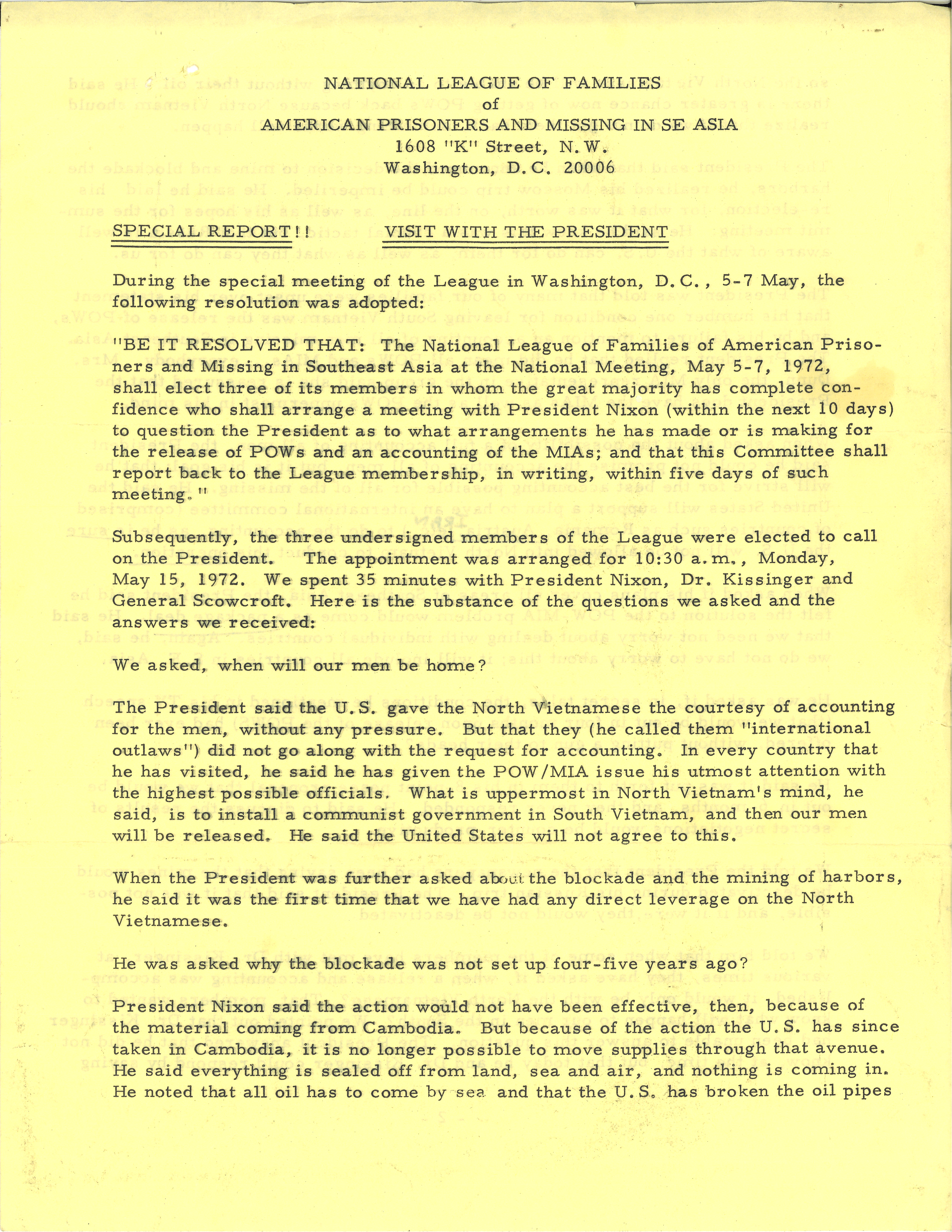 This report was issued by the National League of Families of American Prisoners and Missing in Southeast Asia. It details comments made by President Richard Nixon during a meeting with three representatives of the group.