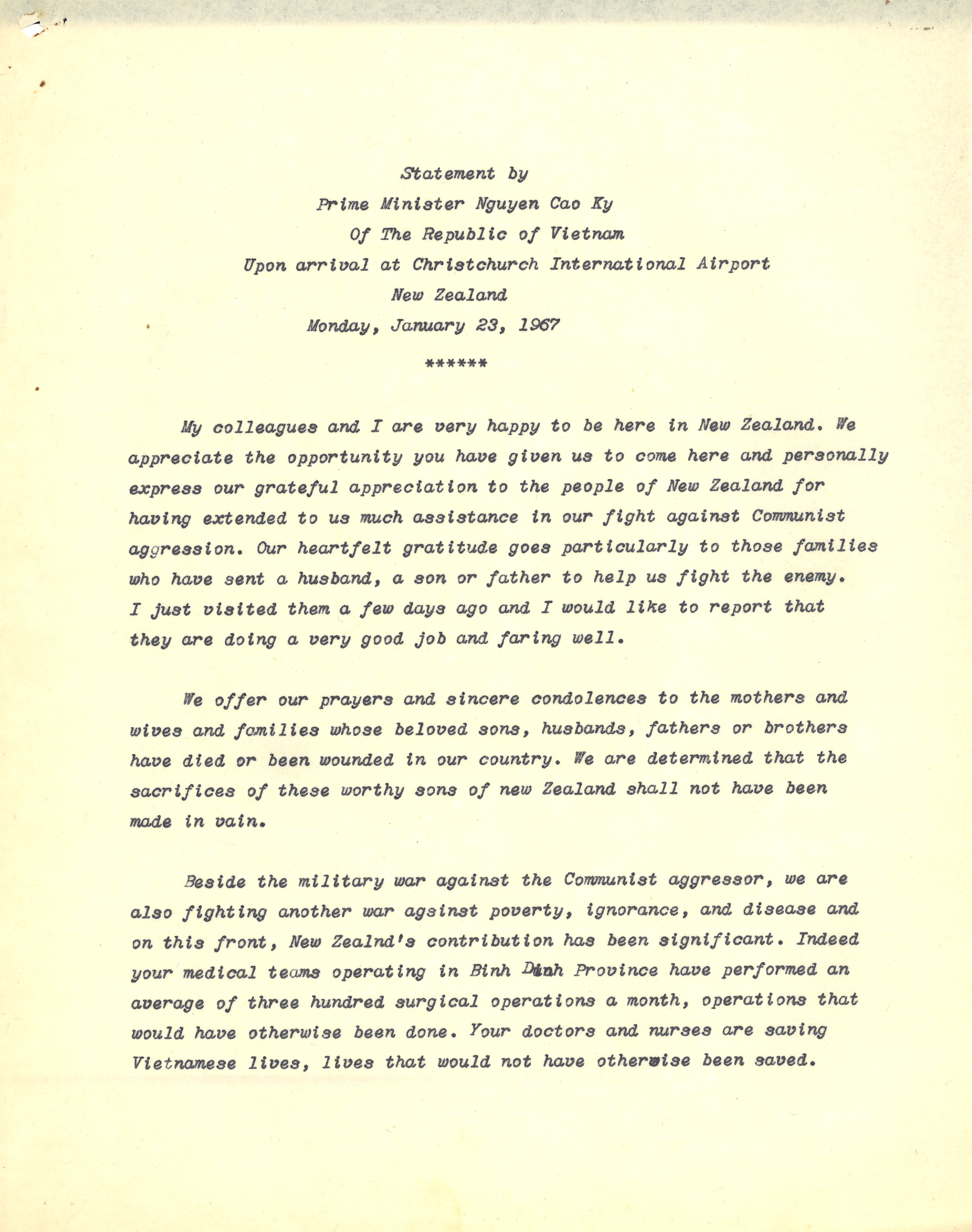 Statement by Nguyễn Cao Kỳ, Prime Minister of South Vietnam, At Christchurch, New Zealand Airport, January 23, 1967
