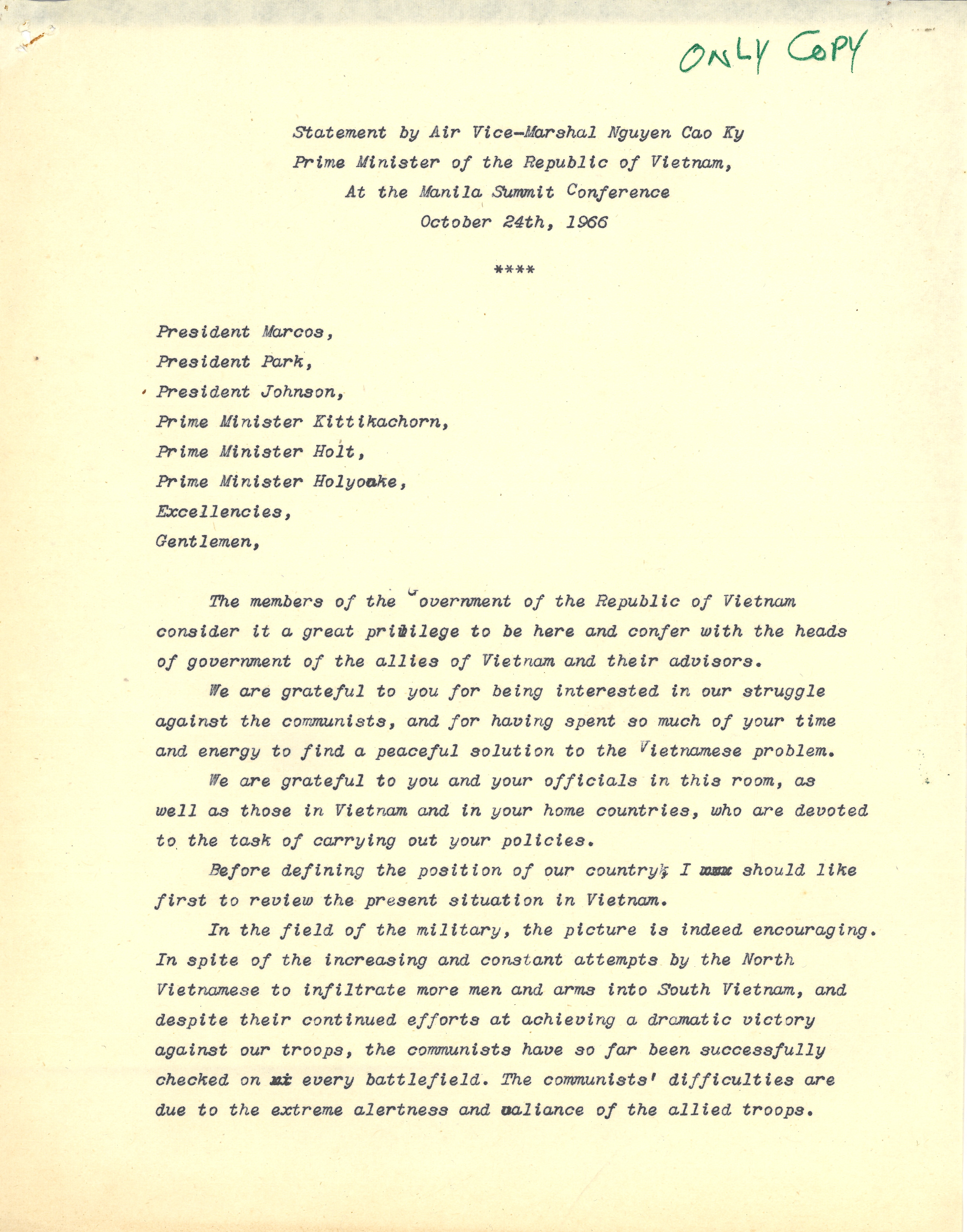 Statement by Nguyễn Cao Kỳ, Prime Minister of South Vietnam, At The Manila Summit Conference, October 24, 1966