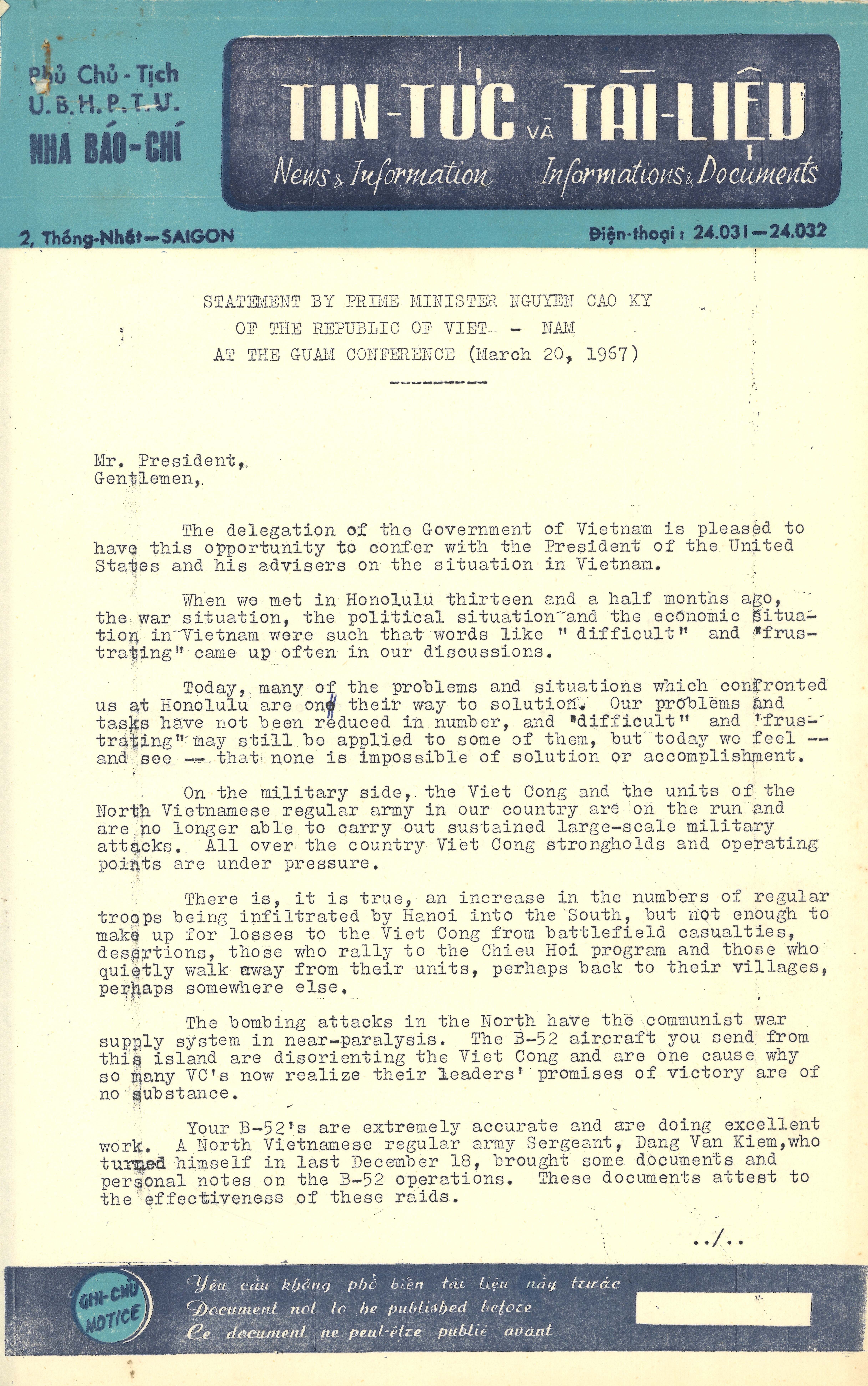 These remarks, delivered at the Guam Conference on Vietnam, addressed U.S. President Lyndon B. Johnson and American government and military officials. In his speech, Kỳ highlights progress in South Vietnam’s fight against the Viet Cong and the country’s move toward democracy. He praises U.S. air support, especially B-52 bombings, and details programs like land reform and the “Chieu Hoi” initiative which offered amnesty and reintegration to former Viet Cong soldiers.