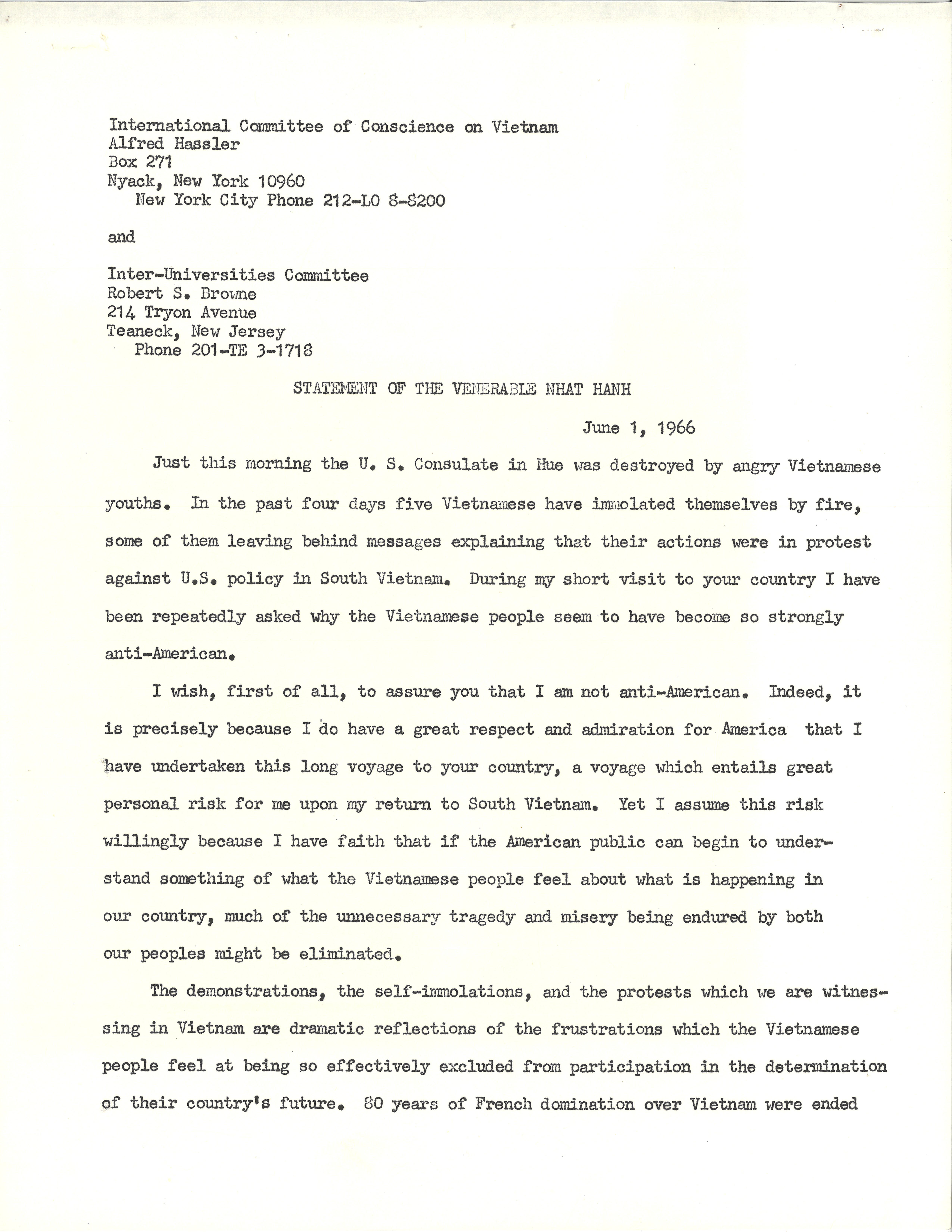 Statement of the Venerable Nhat Hanh, June 1, 1966