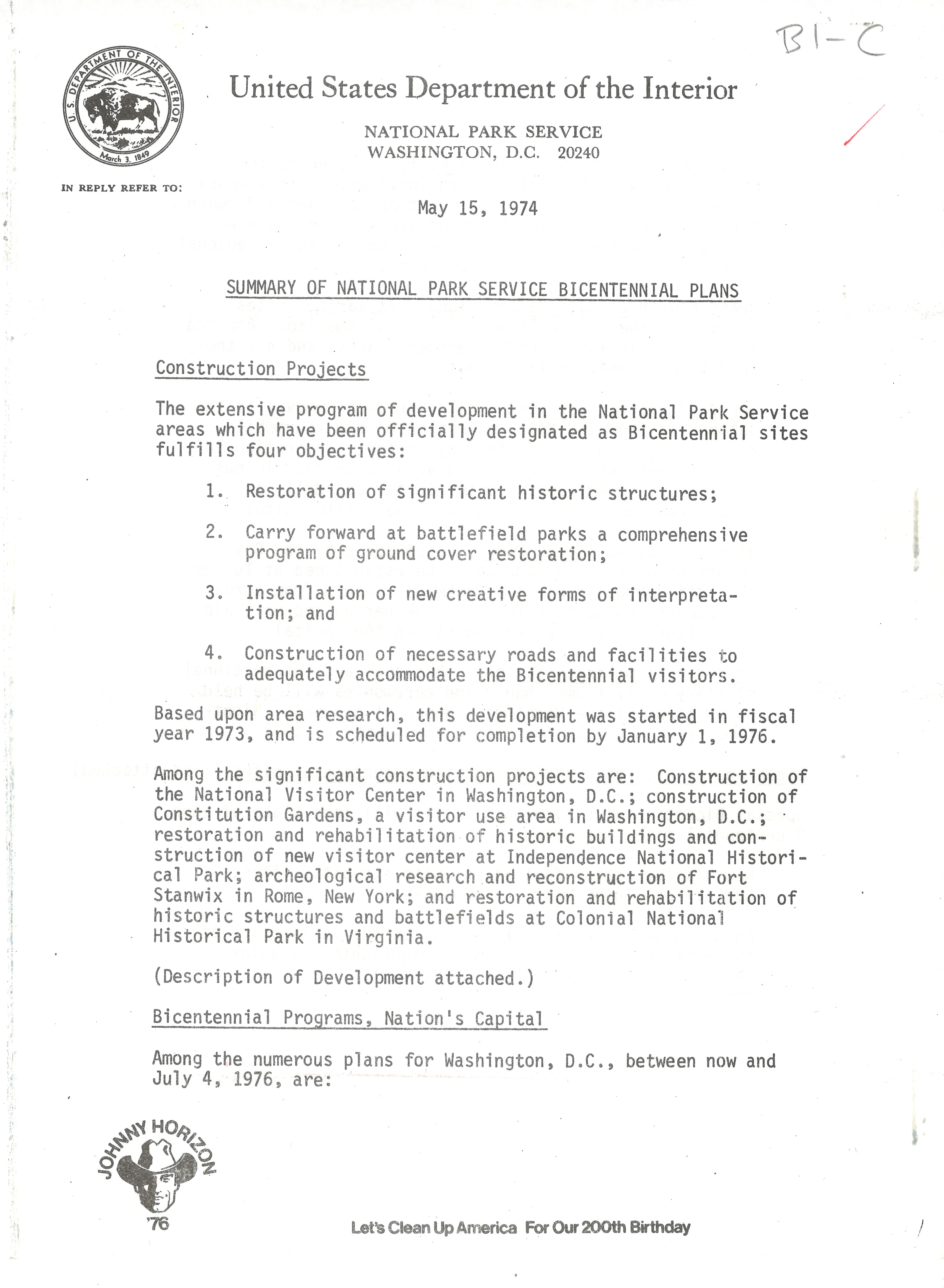 "Summary Of National Park Service Bicentennial Plans", May 15, 1974