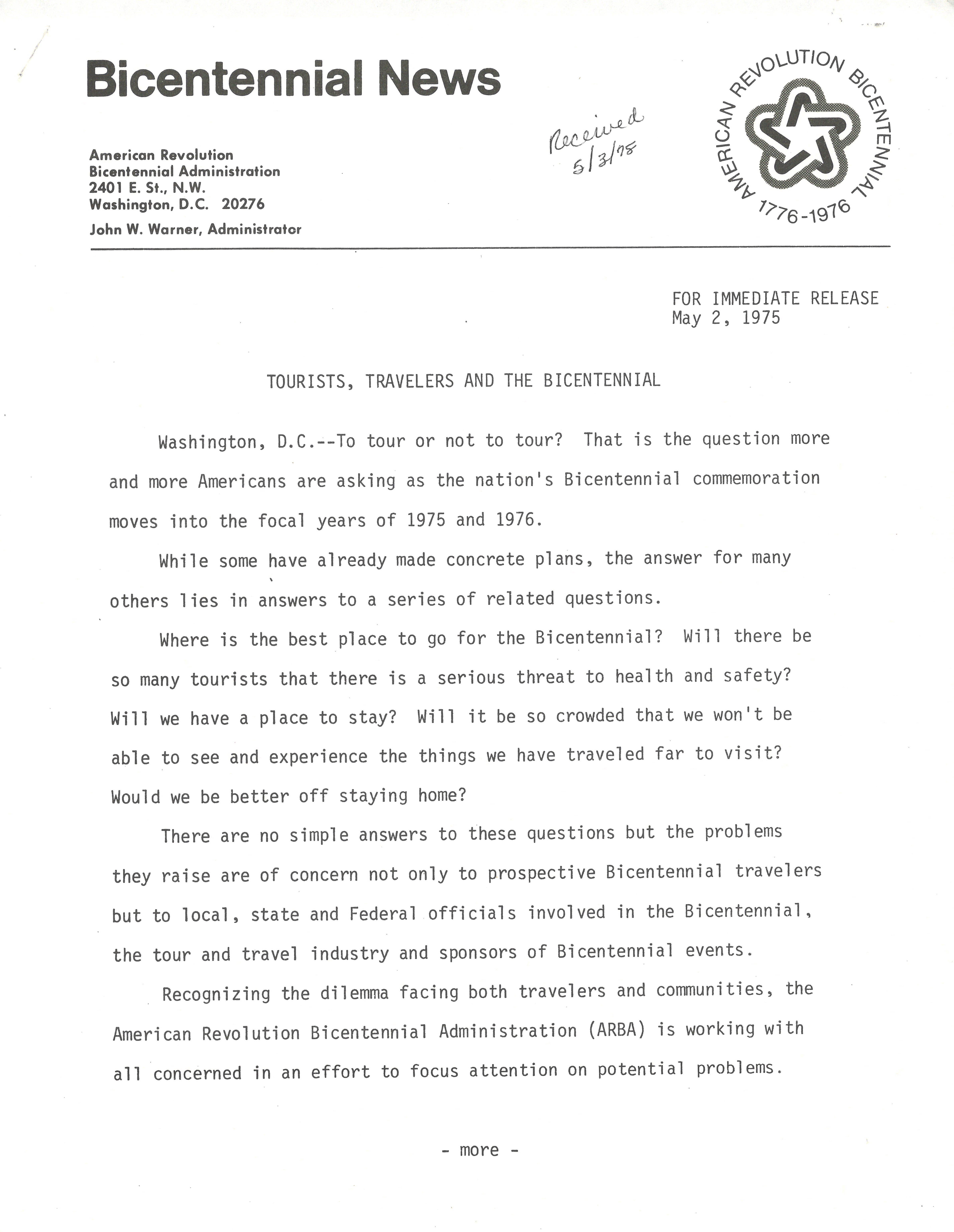 "Tourists, Travelers and the Bicentennial", May 2, 1975