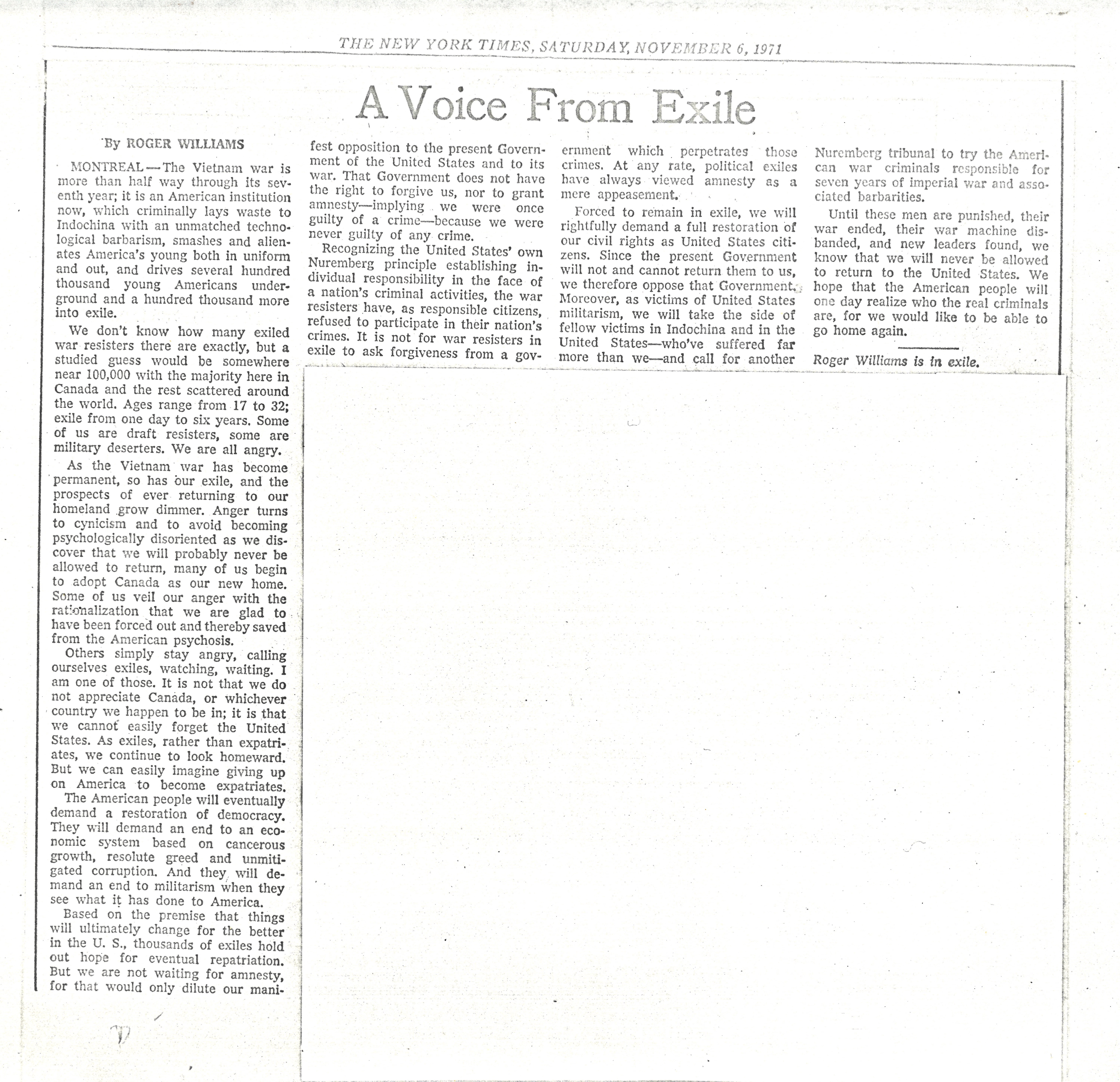 Williams, an American living in exile in Canada, writes that many war resisters fled the U.S. during the Vietnam War because they believed fighting was immoral. He argues that they did not want amnesty or forgiveness, since that would mean admitting guilt, but instead demanded an end to the war. Williams says exiles would continue to protest U.S. militarism, support war victims, and fight for justice even though they could not return home.