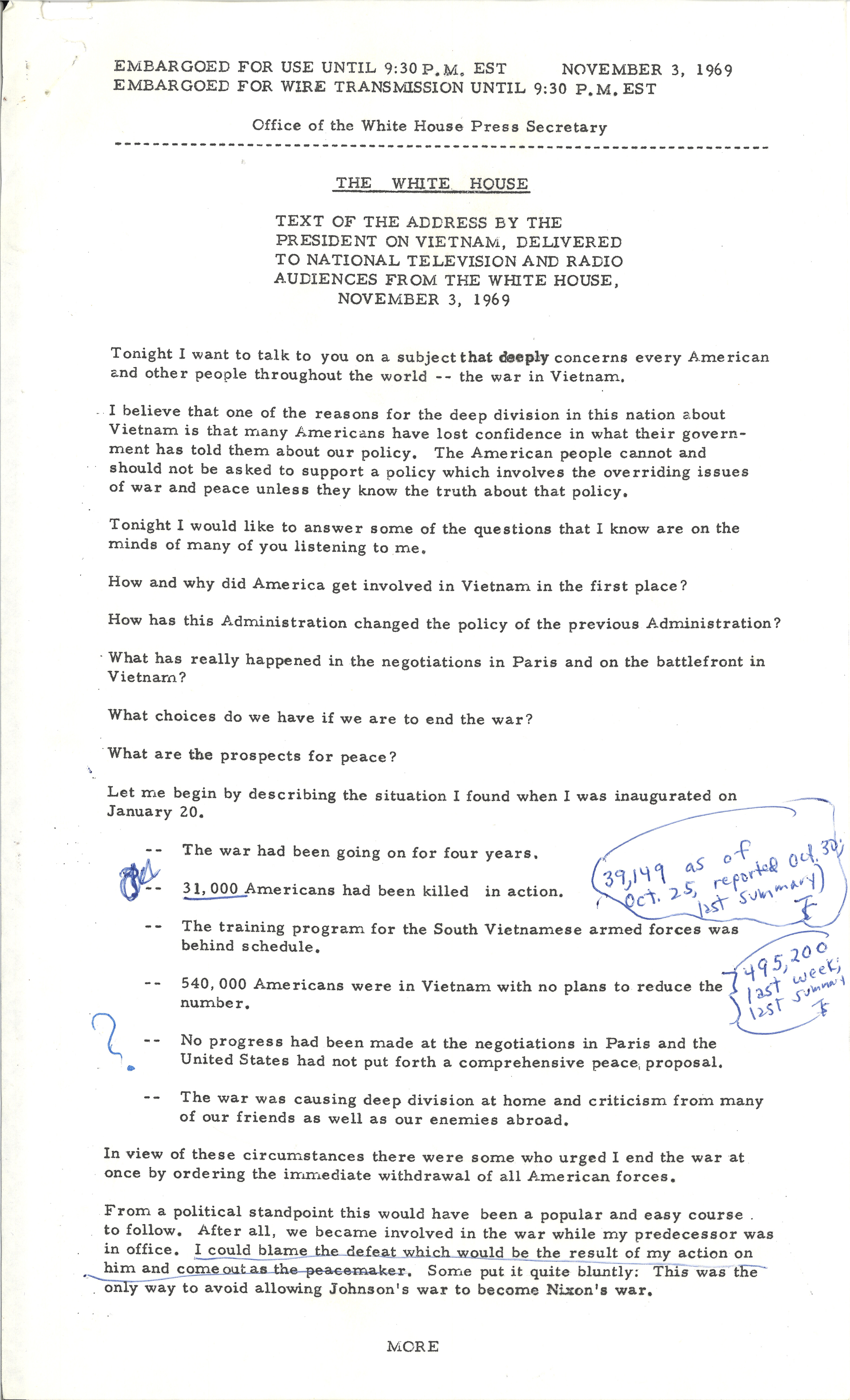 This press release covers a speech delivered over radio and television by President Richard Nixon about the Vietnam War. Nixon explained that while he wanted peace, he would not order an immediate U.S. withdrawal because he believed it would harm America’s honor and security, instead promoting his plan of “Vietnamization,” where South Vietnamese forces would gradually take over the fighting.