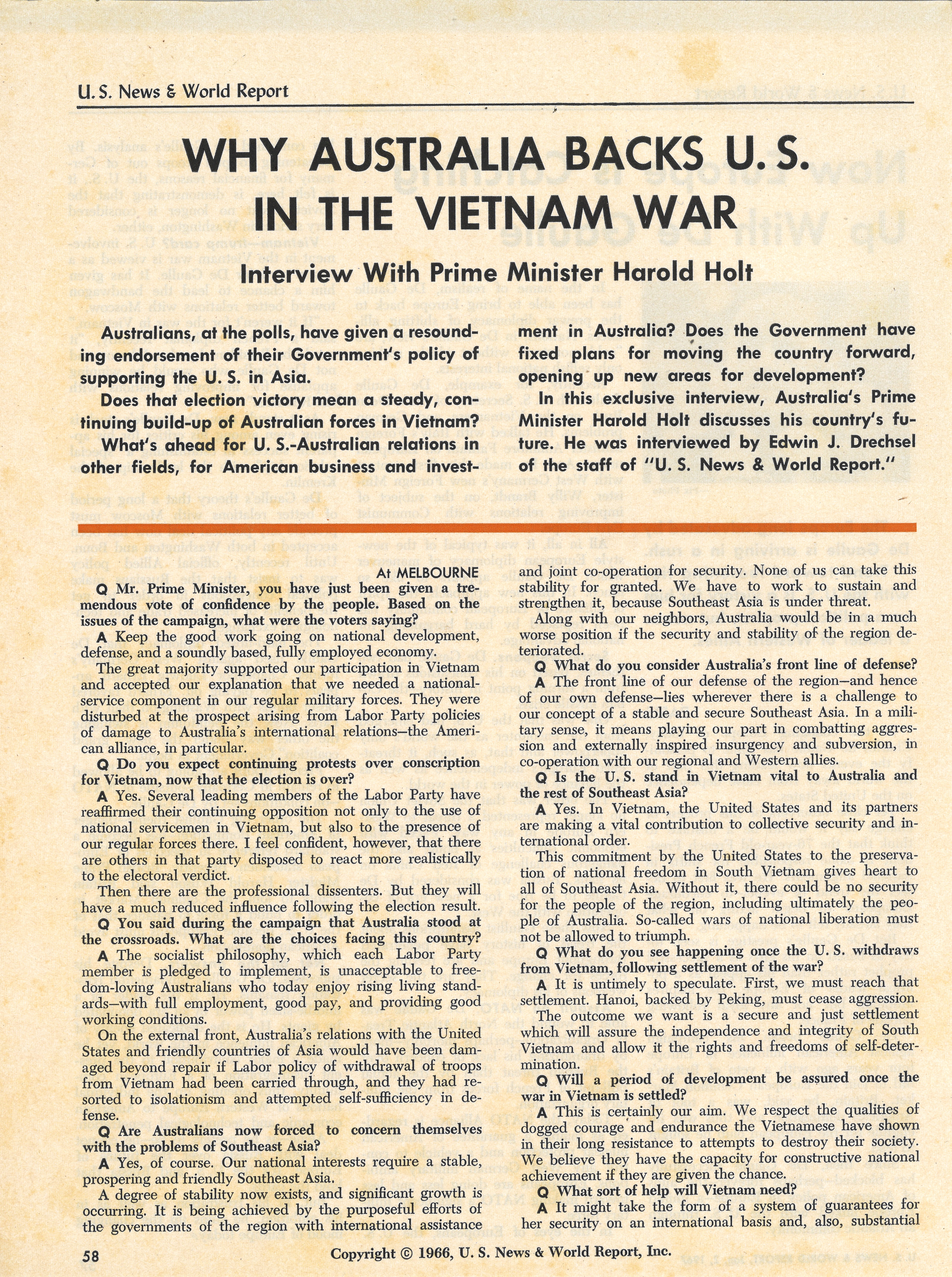 This magazine article covers an interview with Australian Prime Minister Harold Holt who explains why Australia supports the United States in the Vietnam War. Holt says that Australia’s safety depends on keeping Southeast Asia stable and that the U.S. fight in Vietnam helps protect freedom throughout the region.