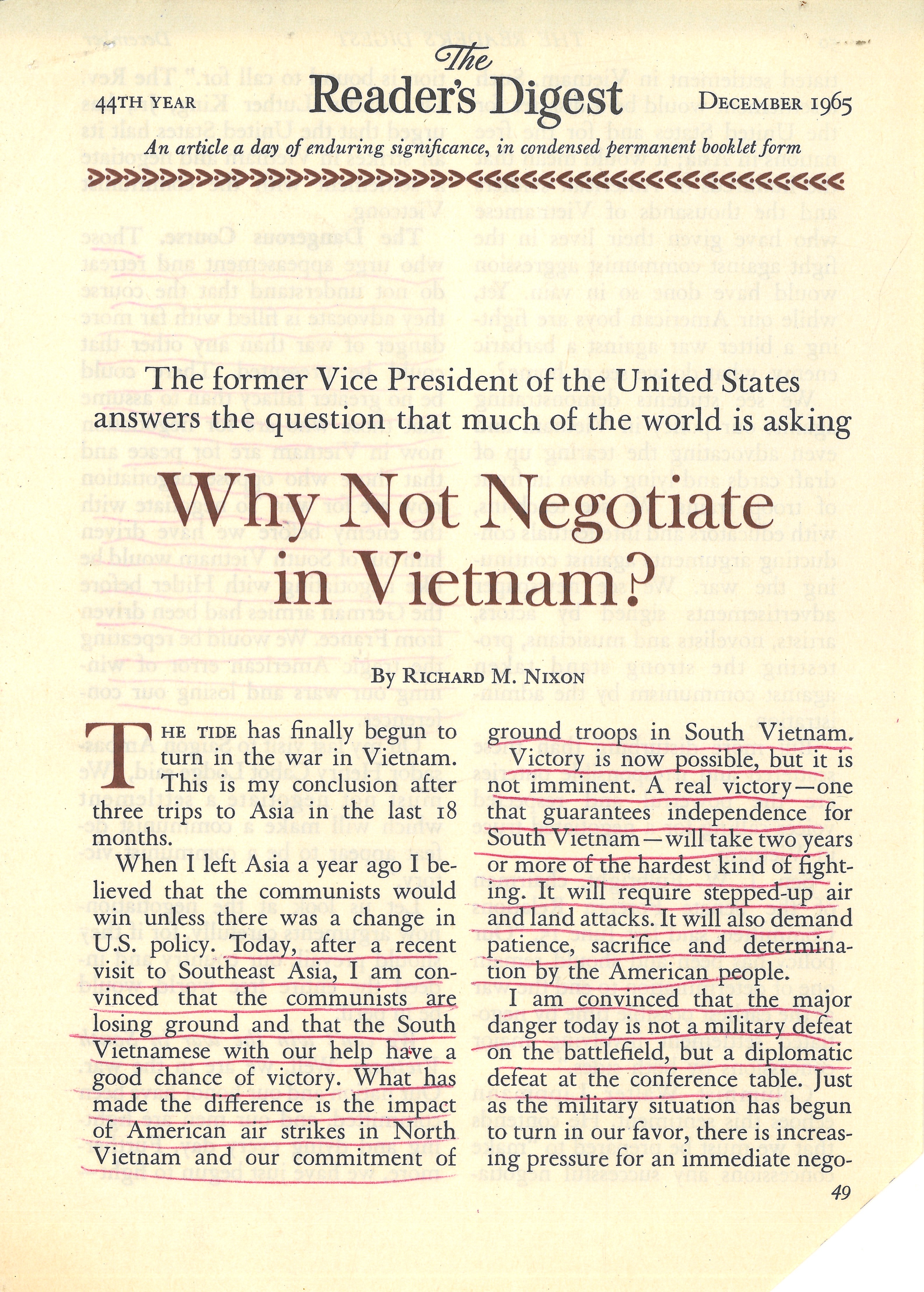 "Why Not Negotiate in Vietnam?" by Richard M. Nixon, The Reader's Digest, December, 1965