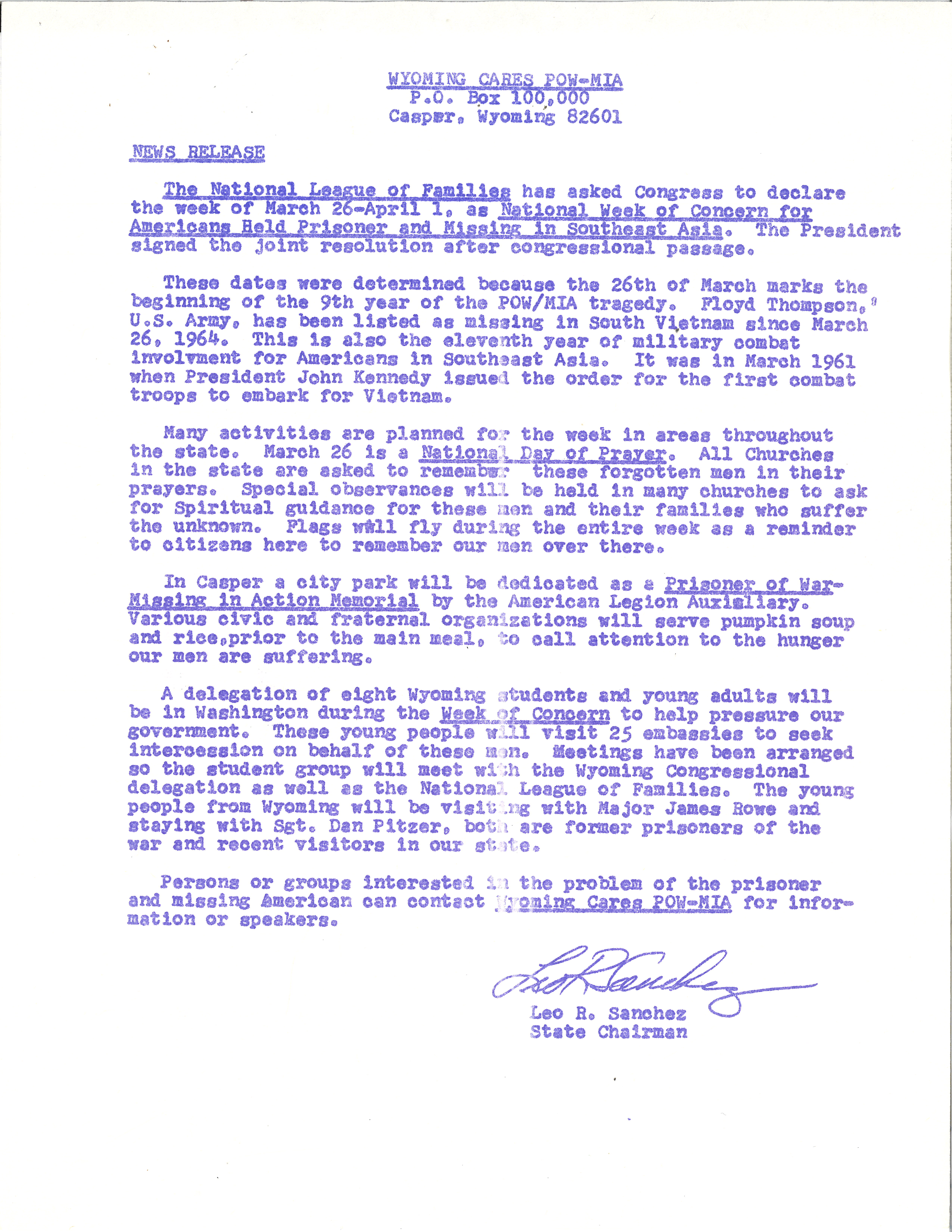 This news release announces a national week of concern for Americans held prisoner and missing in Southeast Asia. Among the activities planned are dedication of a city park in Casper. In addition, a delegation of eight Wyoming students planned to travel to Washington D.C. to pressure the government to take action.
