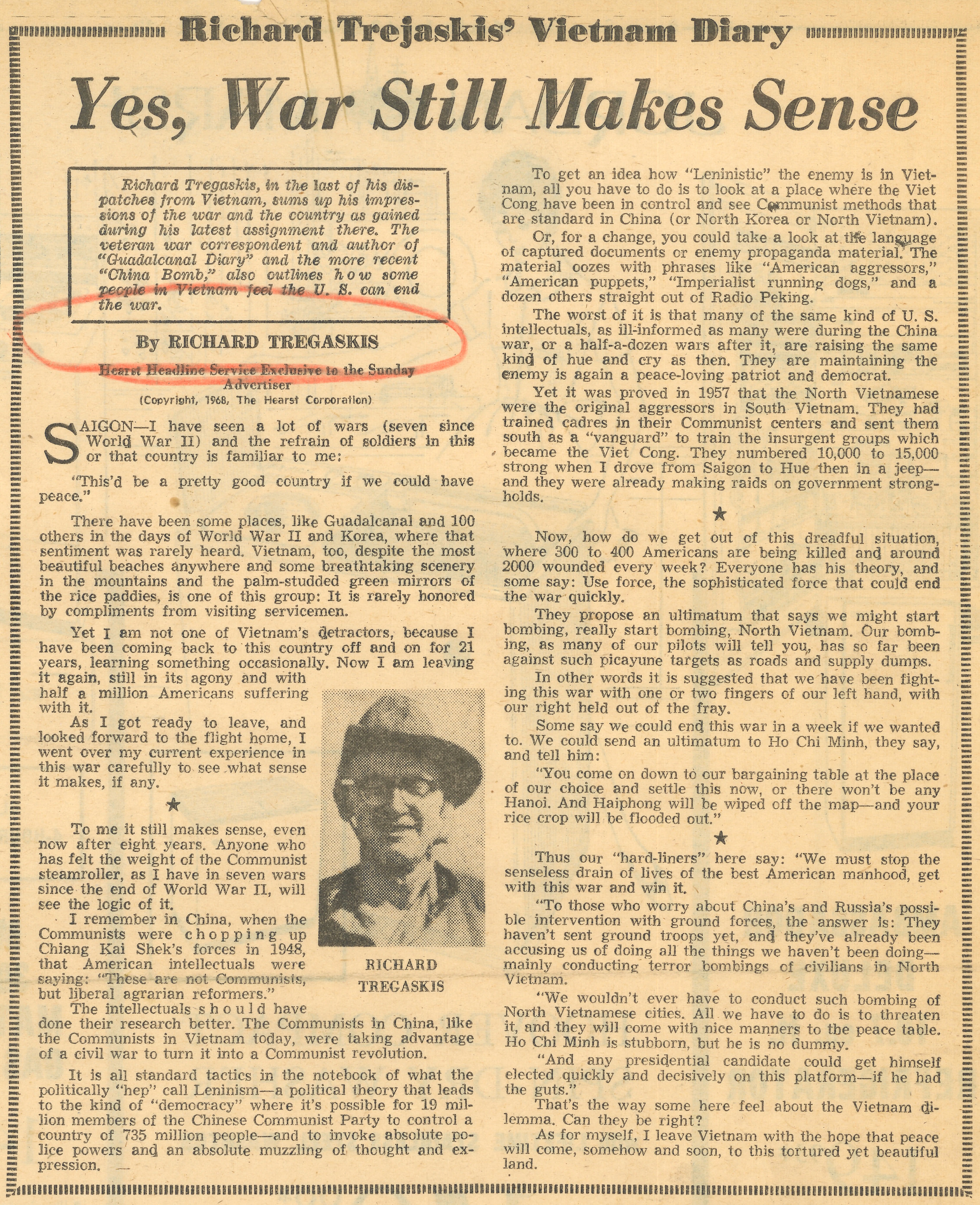 "Yes, War Still Makes Sense" by Richard Tregaskis, Boston Sunday Advertiser, July 7, 1968