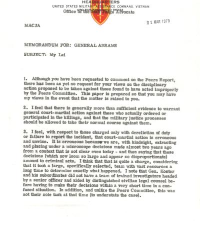 This memorandum from Army lawyer Williams to General Abrams discusses how the Army should handle those involved in the My Lai Massacre in Vietnam. Williams recommends that soldiers who directly participated in the killings face court-martial, but he advises against trying officers accused only of failing to report the incident, saying it would be unfair and damaging to morale. He argues that administrative actions and reprimands would be sufficient, warning that further prosecutions could harm the Army’s reputation.