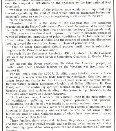 This magazine editorial argues that North Vietnam’s treatment of American prisoners of war violates basic human rights and international law. It supports a U.S. congressional resolution urging peace negotiators to prioritize the humane treatment and release of prisoners during the Vietnam War talks.