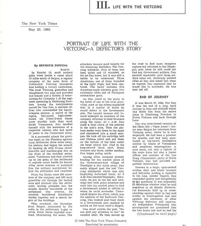 "Portrait Of Life With The Vietcong - A Defector's Story" by Seymour Topping, The New York Times, May 23, 1965