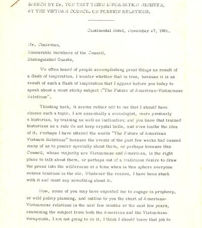 Dr. Ton That Thien delivered this address at the Vietnam Council on Foreign Relations. In it, he explained that the future of U.S.–Vietnamese relations depended on both nations understanding each other’s psychology rather than just politics. He said that Vietnamese people value survival, independence, and dignity above all else, even preferring war with suffering to peace without hope.