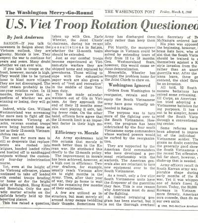 "U.S. Viet Troop Rotation Questioned" by Jack Anderson, The Washington Post, March 8, 1968
