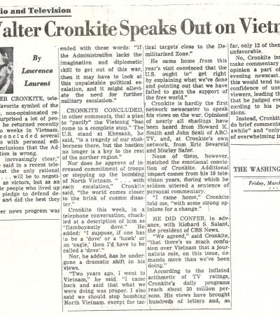 "Walter Cronkite Speaks Out On Vietnam" by Lawrence Laurent, The Washington Post, March 8, 1968