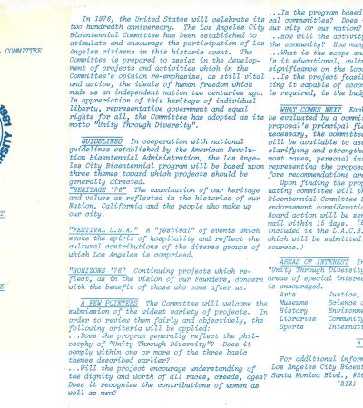 This pamphlet encourages citizens of Los Angeles to get involved in the Bicentennial by proposing projects in support of the theme of "Unity through Diversity".