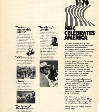 This advertisement from Variety magazine, highlights the Bicentennial-connected television programming NBC has scheduled in the year leading up to July 4, 1976.