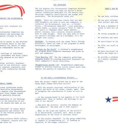 This pamphlet, distributed by the Los Angeles City Bicentennial Committee, introduces the committee and encourages community participation in planning for the Bicentennial.