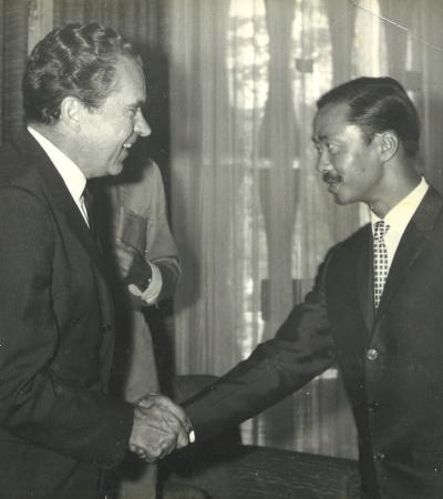 Kỳ and Nixon are shown shaking hands. At the time, Nixon was a former U.S. vice president and had not yet announced his intention to run for U.S. president in the 1968 election.
