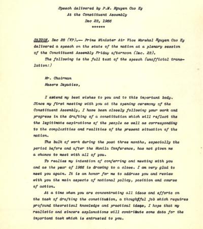 Speech by Prime Minister of South Vietnam Nguyễn Cao Kỳ At The Constituent Assembly, December 23, 1966