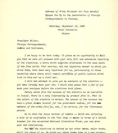 Address of Nguyễn Cao Kỳ, Prime Minister of South Vietnam, To The Association Of Foreign Correspondents In Vietnam, September 16, 1966