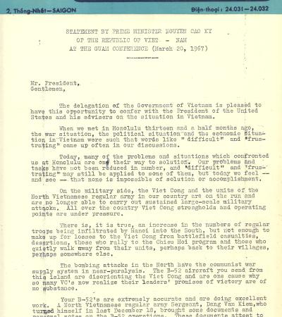 Statement by South Vietnamese Prime Minister Nguyễn Cao Kỳ At The Guam Conference, March 20, 1967