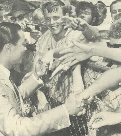South Vietnamese Prime Minister Nguyễn Cao Kỳ shakes hands with some of the more than 300 Australians who greeted him in Brisbane, Australia. Kỳ traveled to Australia seeking to bolster Australia's continued support for the Vietnam War.