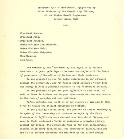 Statement by Nguyễn Cao Kỳ, Prime Minister of South Vietnam, At The Manila Summit Conference, October 24, 1966