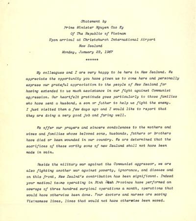 Statement by Nguyễn Cao Kỳ, Prime Minister of South Vietnam, At Christchurch, New Zealand Airport, January 23, 1967