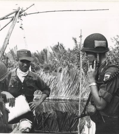 This Viet Cong prisoner has been captured by the South Vietnamese Army (ARVN) south of Saigon. He was transported by a U.S. Army helicopter from the battlefield so that he could be transferred to the South Vietnamese Army for questioning. The captive is shown here with U.S. Army Sergeant Alfred Compton (left) and U.S. Army Specialist Joseph Reed (center) and unnamed members of the ARVN.