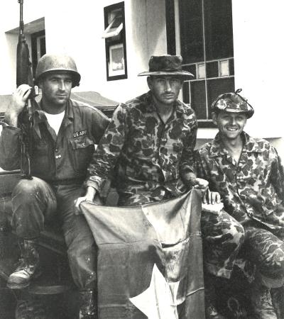 Three American infantry advisors pose with a captured Viet Cong communist flag after an assault operation against Viet Cong guerrillas. They are pictured outside their barracks, where they stay when they are not out on assault operations in the high mountain jungles.