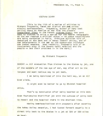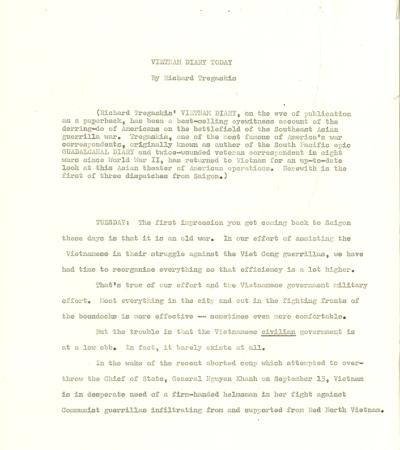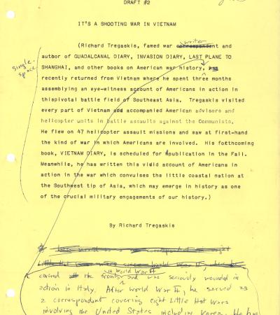 In this draft article, Tregaskis describes America’s active and dangerous role in the Vietnam War, showing that U.S. forces are deeply involved in combat, not just training. Through detailed accounts of helicopter missions, ambushes, and battles, he highlights the bravery and risks faced by American advisors, pilots, and Special Forces fighting alongside South Vietnamese troops.