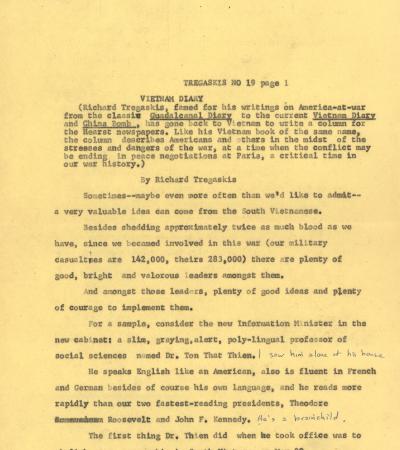 In this draft article, Tregaskis writes about South Vietnam’s new Information Minister, Dr. Ton That Thien, who values freedom of the press as essential to democracy. Dr. Thien, a multilingual professor, abolished press censorship soon after taking office and believes that open media helps people change their government without violence. While acknowledging flaws in South Vietnam’s press, he argues that mature societies accept that newspapers can make mistakes and should remain free from governmental control.