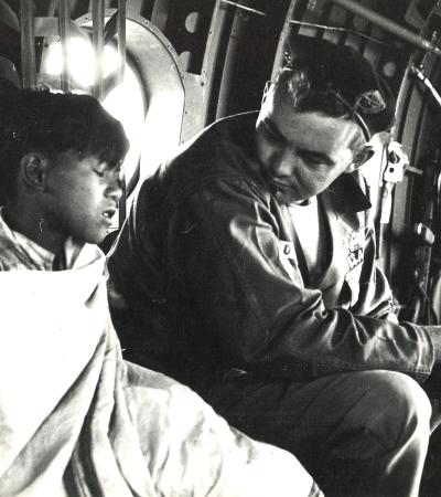 U.S. Special Forces medic John "Doc" Colin watches over a Montagnard boy with a broken leg. Medical treatment is scarce in the region of Vietnam where the Montagnards live, and the Special Forces medics build goodwill taking care of the injured and sick.