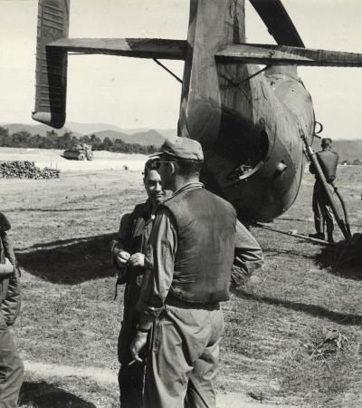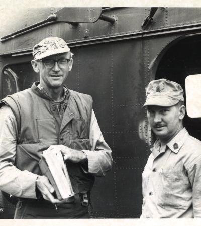 War correspondent Richard Tregaskis stands in front of a U.S. Marine helicopter with Master Sergeant George Peart, who is a gunner and crew chief on assault missions with the Marines.