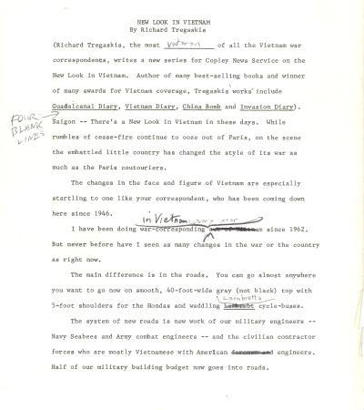 This is a draft of a three part article for Copley News Service. It describes changes the author has observed in Vietnam over the later years of the Vietnam War. It makes special note of the building of new roads, bases, and infrastructure by American and Vietnamese workers. These projects improved transportation and created job opportunities—many of them for women, who worked as builders, contractors, and business owners.