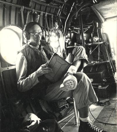 War correspondent Richard Tregaskis rides in a U.S. Army helicopter which is on an assault mission.