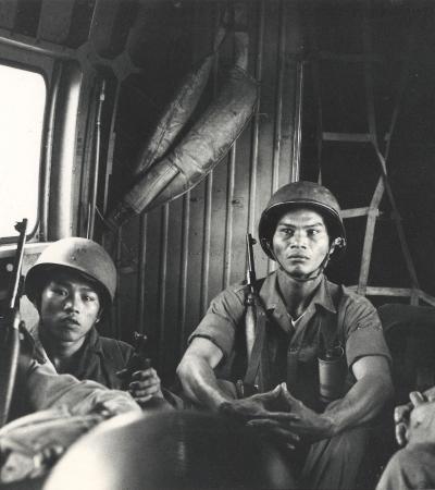 South Vietnamese troops in a U.S. Marine helicopter, heading for an assault into Vietcong territory.