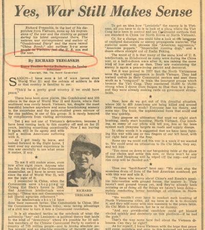 "Yes, War Still Makes Sense" by Richard Tregaskis, Boston Sunday Advertiser, July 7, 1968