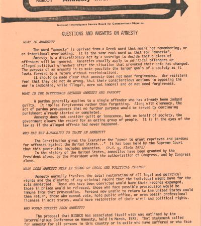 This fact sheet was published by the National Interreligious Service Board for Conscientious Objectors (NISBCO). Despite the official end of U.S. involvement in the Vietnam War, hundreds of thousands of draft violators and military deserters were still being punished. NISBCO argued for an unconditional amnesty program.