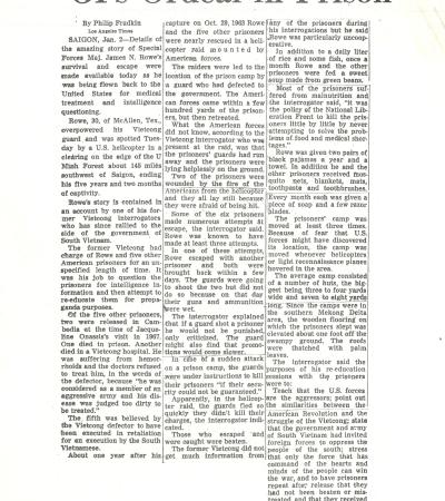 Special Forces Major James N. Rowe spent over five years as a prisoner of war in the Vietnam jungle before he overpowered a guard and was rescued by U.S. forces. During his captivity, he and other prisoners suffered from malnutrition & harsh living conditions. They made repeated escape attempts and were forced to attend “re-education” sessions by their captors.