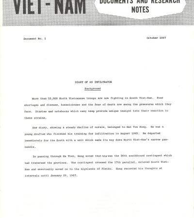 This document, distributed by the Joint United States Public Affairs Office in Saigon, Vietnam, is a translation of the diary of a North Vietnamese soldier who was sent to fight in South Vietnam. The diary was captured on March 14, 1967 by the U.S. 25th Infantry Division.